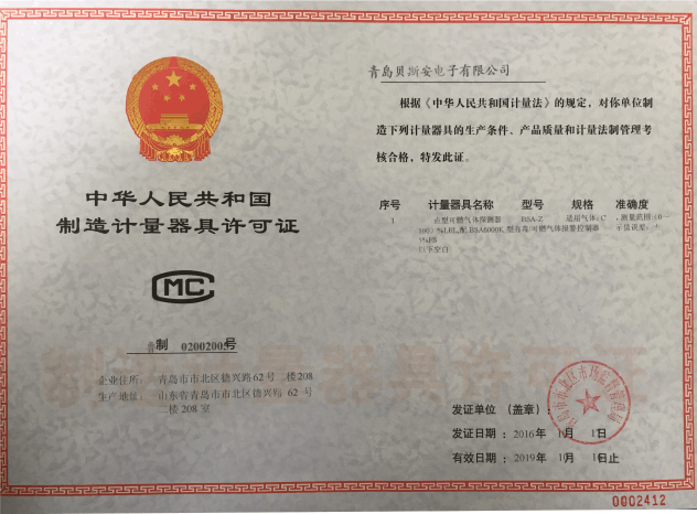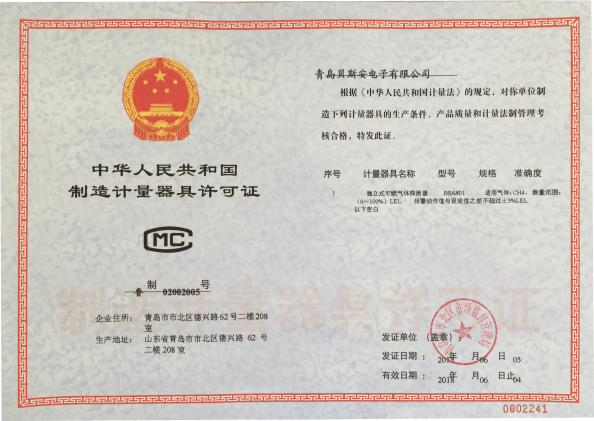 我公司是青島市具有國(guó)家質(zhì)量技術(shù)監(jiān)督部門頒發(fā)的計(jì)量器具生產(chǎn)許可證的生產(chǎn)企業(yè);獲得國(guó)家防爆電氣產(chǎn)品質(zhì)量監(jiān)督檢驗(yàn)中心頒發(fā)的防爆合格證;獲得國(guó)家公安部消防產(chǎn)品合格評(píng)定中心頒發(fā)的消防產(chǎn)品形式認(rèn)可證書。